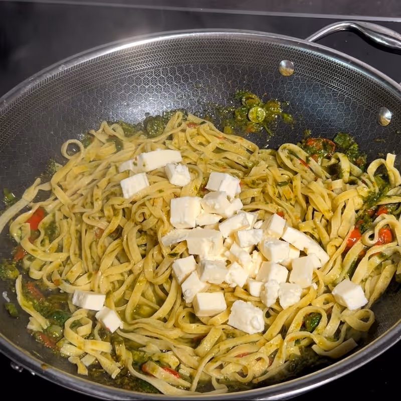 - Add the Cheese: Dice your salty cheese. I use Romanian telemea but soaked feta works well too. Cut it into small cubes and gently mix it into the pasta.