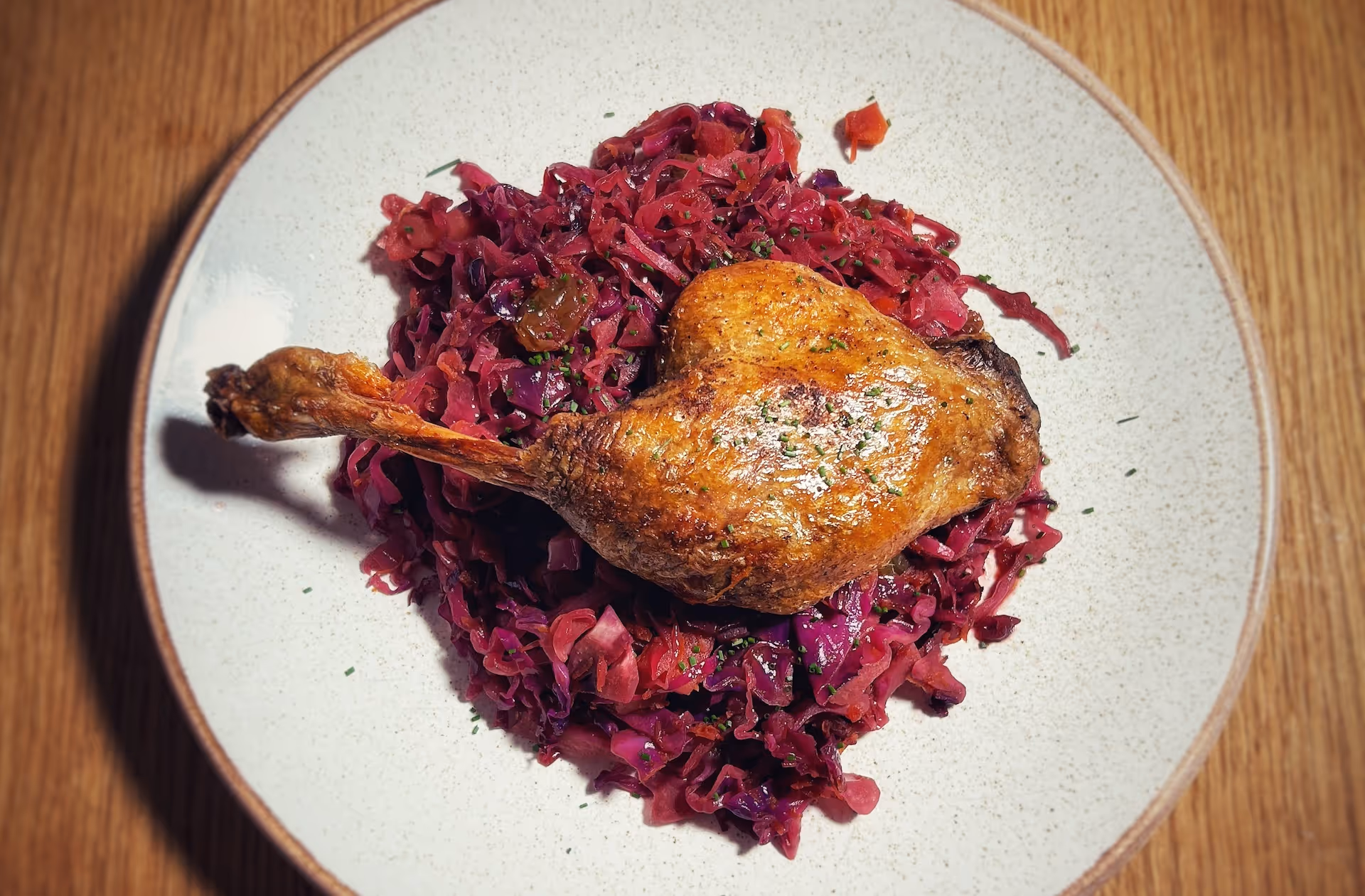 Comfy and crunchy duck confit on a sweet and delicious braised red cabbage bed