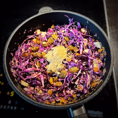 - Chop the red cabbage. Try to do fine strips, but if you can't, just do it your way. Transfer it to the pan, stir and move to the next ingredients.