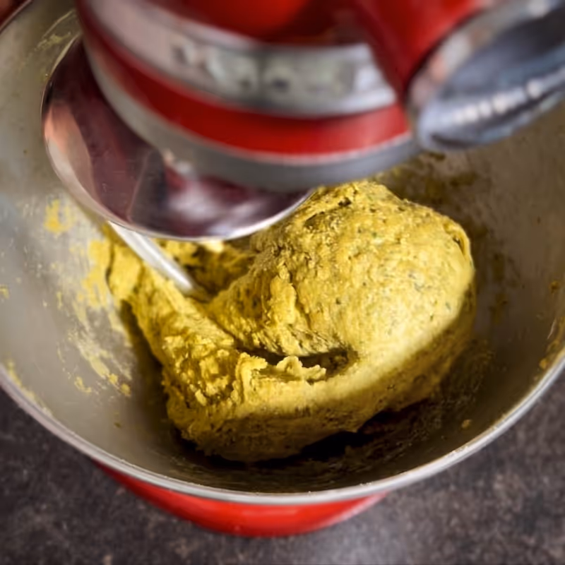 - Add the paste to a mixer with 2 tablespoons of oil, around 300g of flour, and 50g of semolina.
