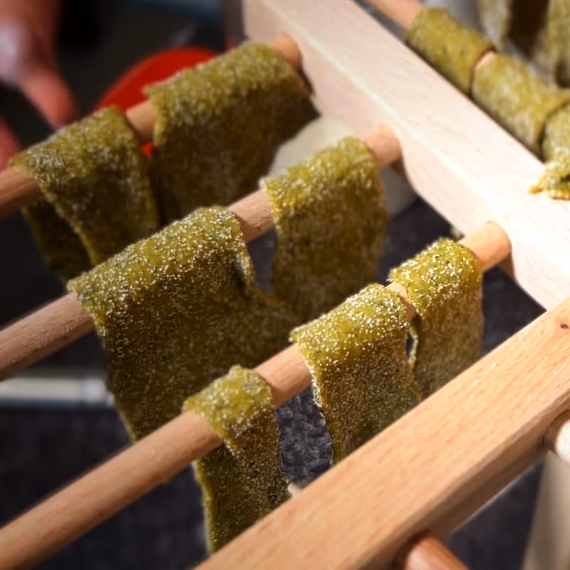 - Once the pasta is rolled, cut it into rustic, irregular strips. Dust the strips with semolina and place them on a pasta drying rack. If you don’t have a rack, place them on parchment paper, turning them every 20-30 minutes to avoid them getting damp. Repeat with the remaining dough. Allow the pasta to dry for at least 2-3 hours.