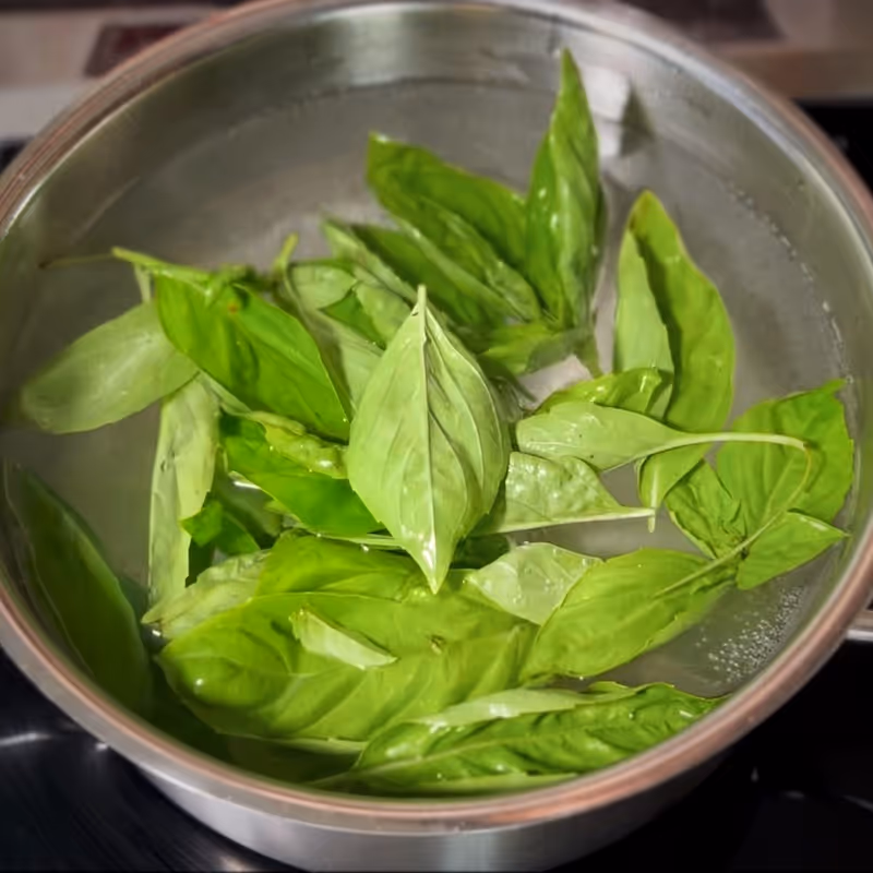 - Blanch 35g of fresh basil leaves for 10-15 seconds.