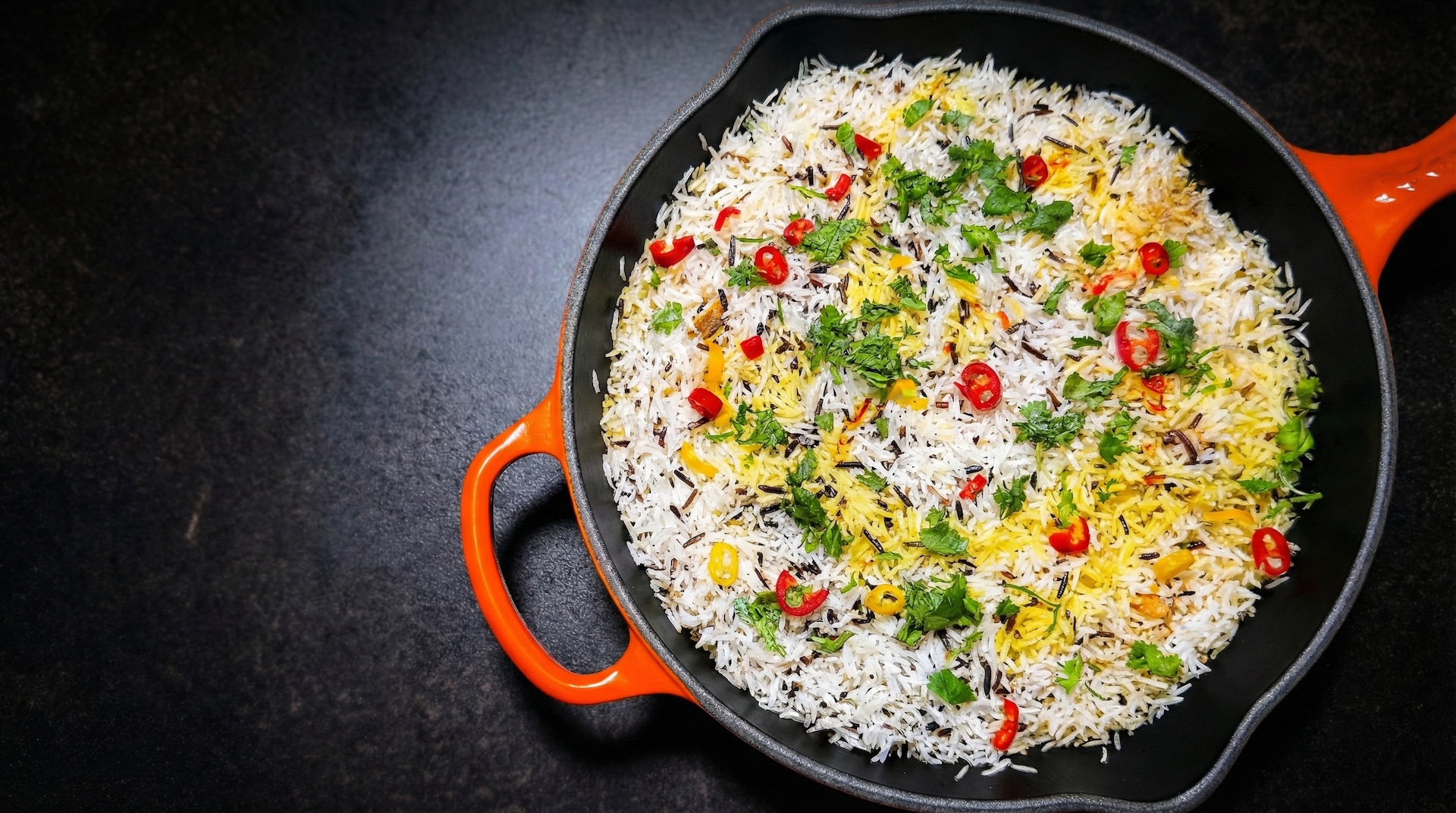 Chicken Biryani (dum style) in a cast iron with ghee, saffron, and cardamom. Learn the science behind fluffy rice and perfect texture at home.