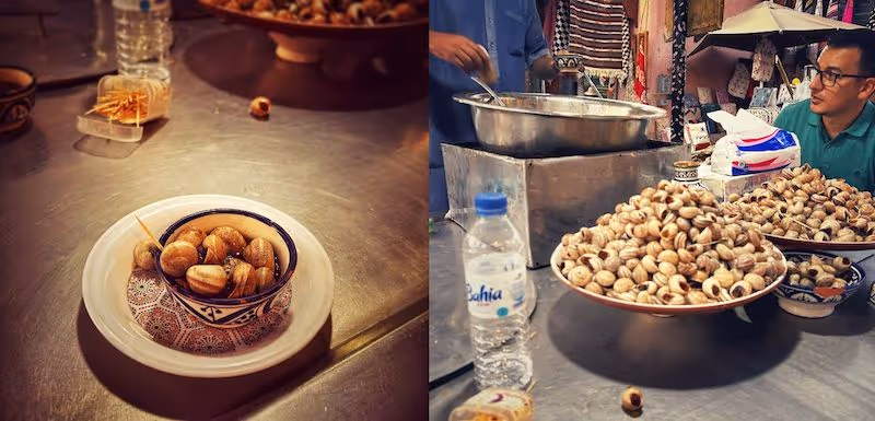 Moroccan snails: a street-stall staple in Marrakech's Jemaa al-Fnaa, are cooked in a flavorful broth called 'babbouche' using a blend of over 15 spices, creating a unique and delightful dish that is embraced by locals and often overlooked by tourists.