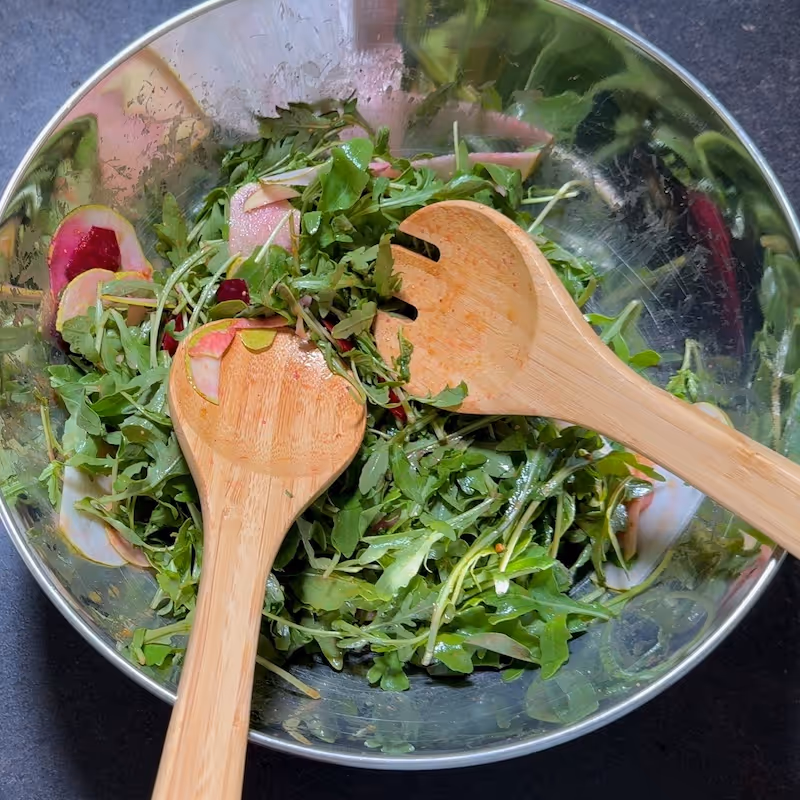 A: Dress only the portion you plan to eat. Pack the greens, toppings, and dressing separately; combine right before lunch to keep the arugula crisp.
