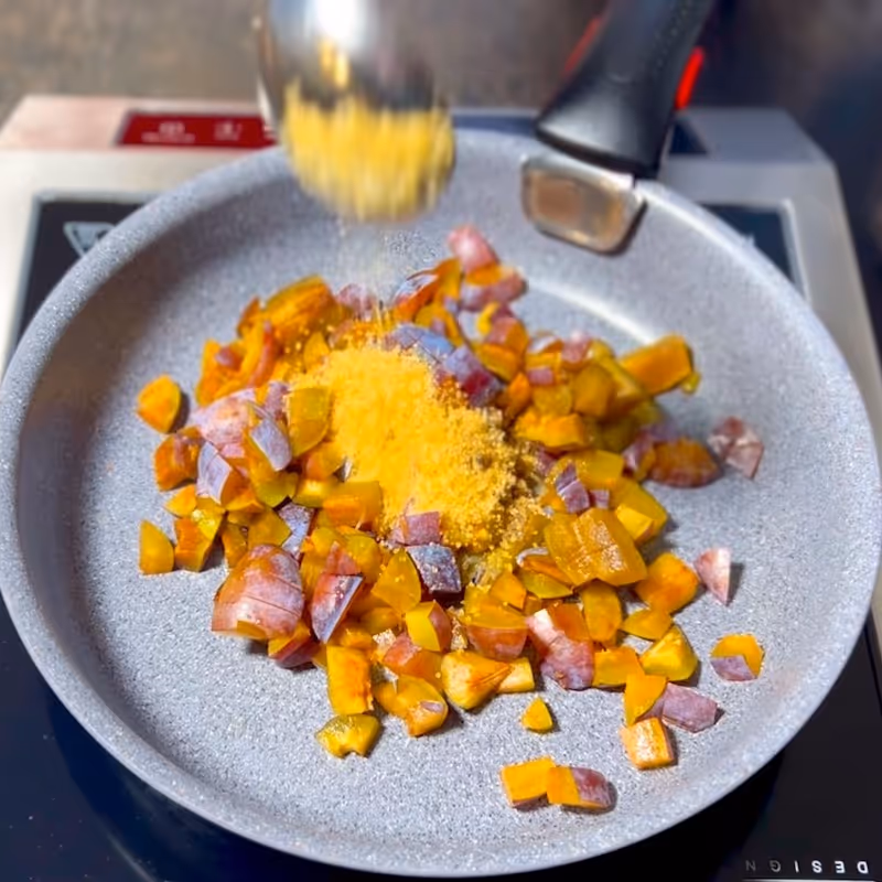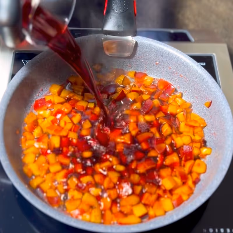 - Make the Plum Sauce: Cook the diced plum with lemon juice, brown sugar, star anise, black peppercorns.