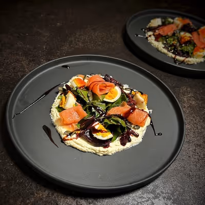 - To assemble, begin by layering the cream cheese mixture on the plates. Next, add the marinated beet greens. Top with roasted beets, chopped eggs, and smoked salmon portions.