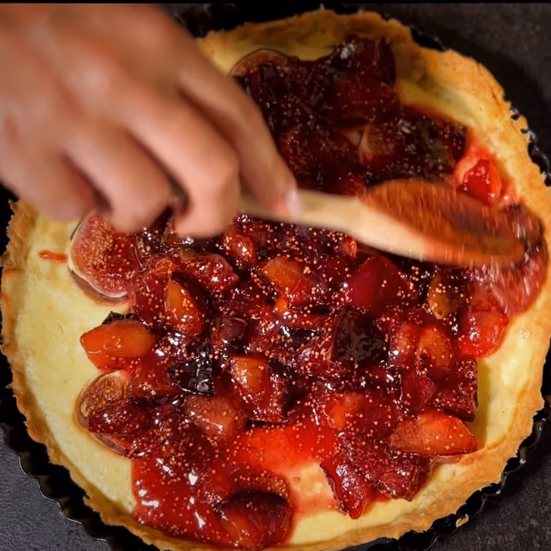 - Carefully spread the jam over the tart. Be gentle to avoid breaking the soft ricotta layer, as it is not fully cooked yet.