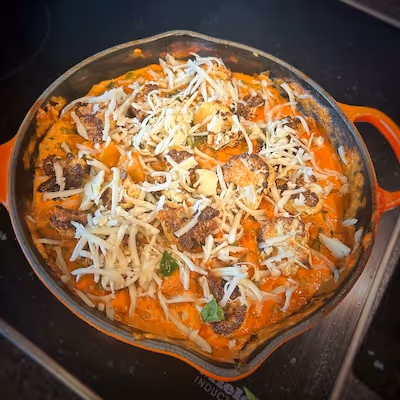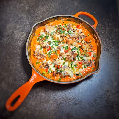 The combination of fresh garden vegetables with the creamy, rich texture of the sauce and crispy, cheesy cauliflower creates a delightful contrast. Furthermore, this dish is packed with nutrients such as vitamins from the cauliflower and leafy greens, and carbohydrates from the potatoes.
