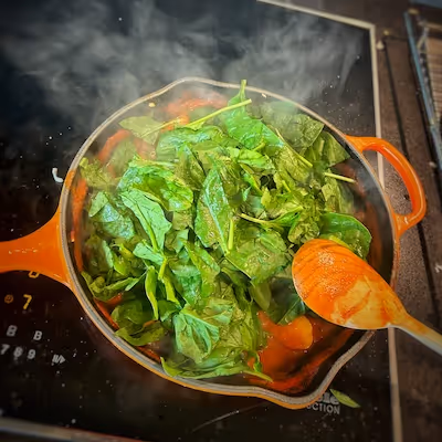 - Final Touches: Now, let's return to the cast iron. Add your chopped spinach, Swiss chard or beet leaves, and peas.