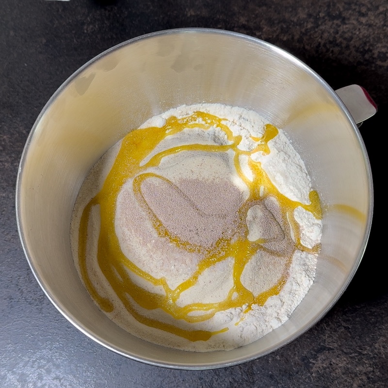 - Mix the Dough: In a large mixing bowl, combine the all-purpose flour, semolina, salt, yeast and 1 tbsp olive oil.
