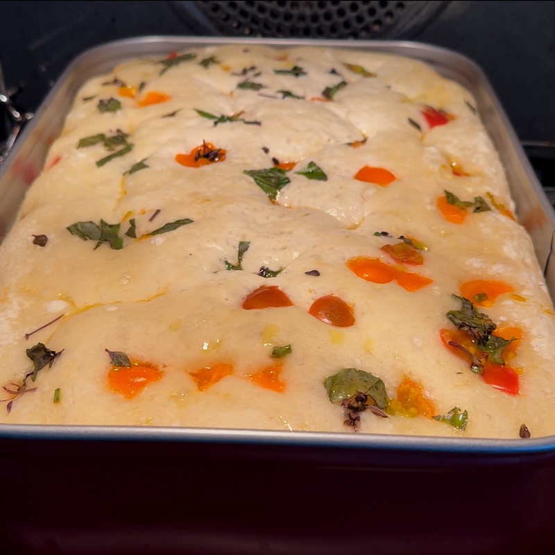 - Bake: Preheat the oven to 220°C (400°F). Cover the focaccia loosely with aluminum foil and bake for 30 minutes. Remove the foil and bake for another 30 minutes until golden.