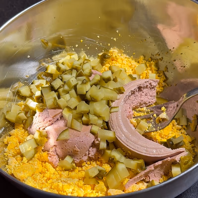 In our household, this recipe evolved even further. Instead of simply mixing yolks with mayo and mustard, we brought in a bit of our Eastern European roots — the rich flavor of liver pâté, the tang of pickles, and a hint of heat from hot sauce. It’s a small twist that gives personality and warmth to a traditional dish.