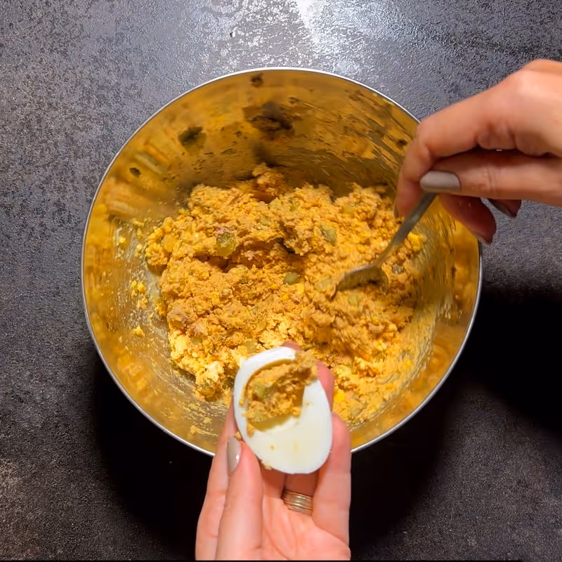 - Assemble the Eggs: Spoon the filling into the egg white halves.
