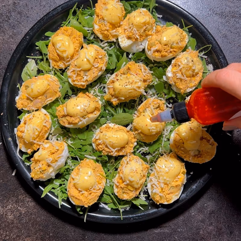 Creamy and spicy deviled eggs with homemade mayo, liver pâté, and hot sauce — a comforting twist on the classic stuffed eggs recipe.