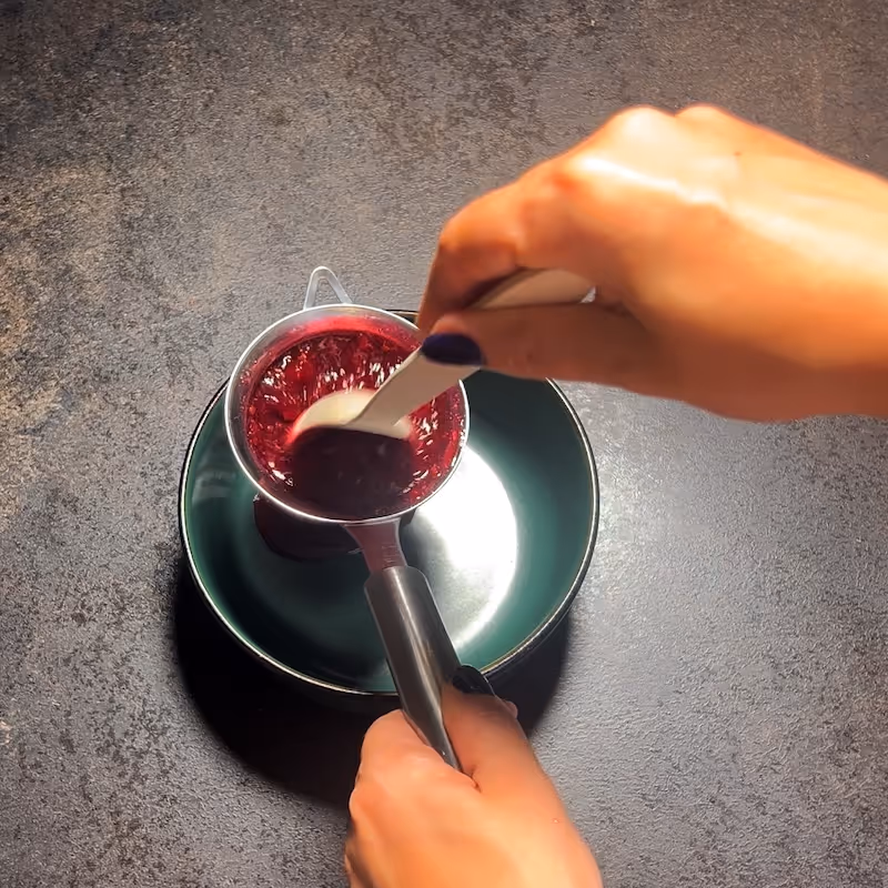 - When the fruits have left all their juices, the sugar has dissolved, and it starts to boil, put everything in a blender and pulse until you have a smoothie-like composition.