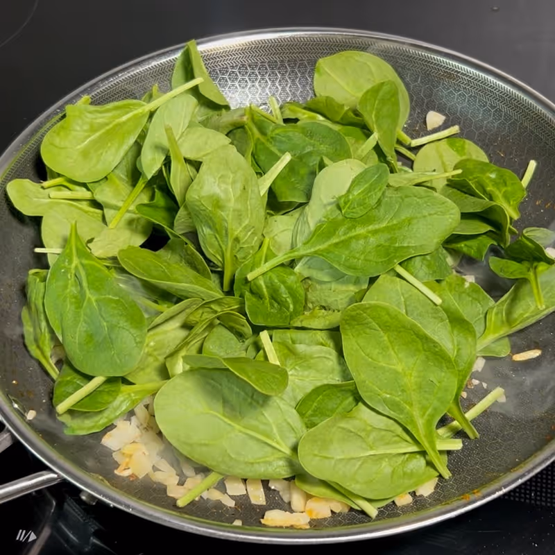 - In the same pan, add diced onion and sauté. Incorporate 100g baby spinach and 1 tbsp grated ginger, cooking for 2-3 minutes.