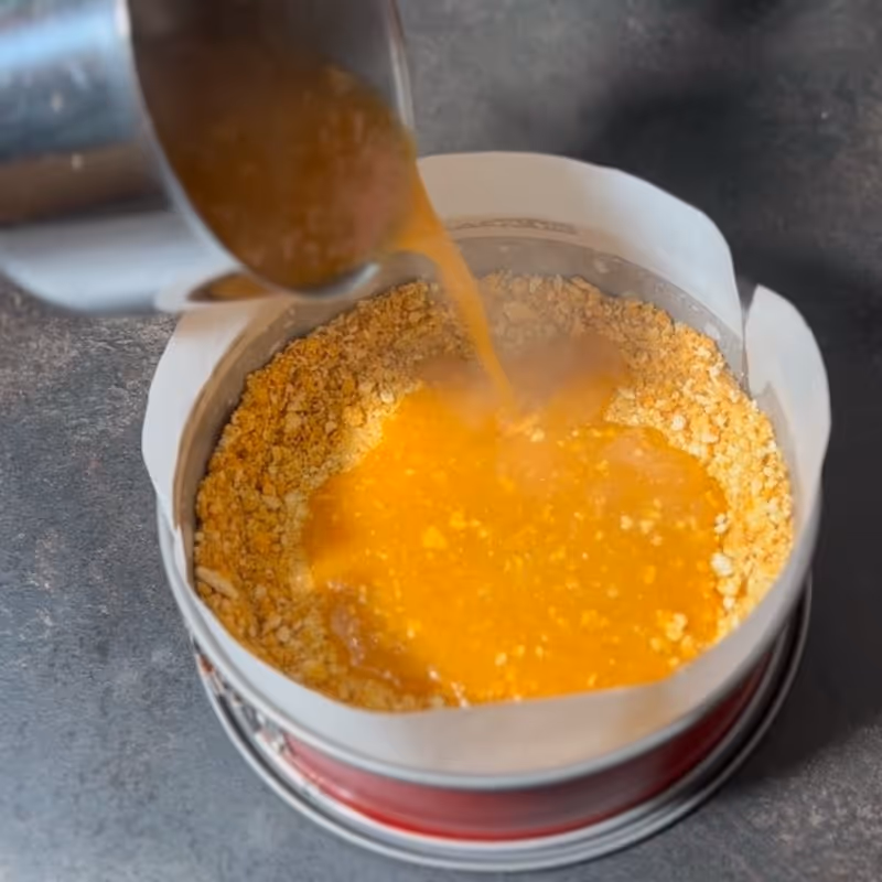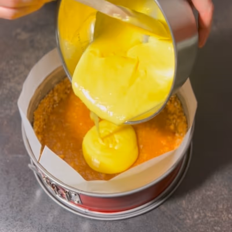 - Strain the custard to remove passion fruit seeds and lumps, aiming for a silky texture. Pour it over the caramel layer in the pan.