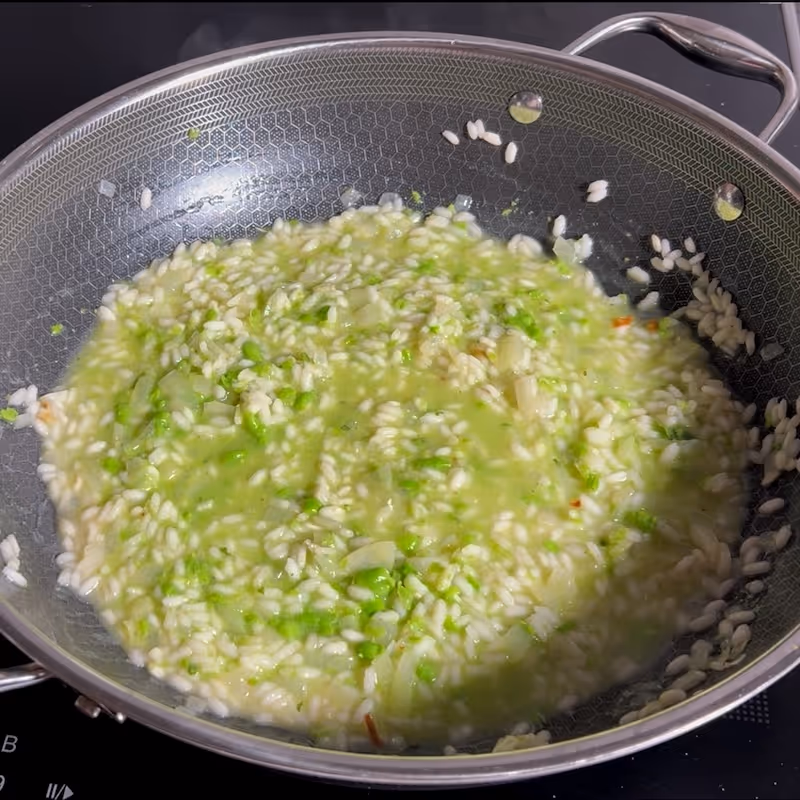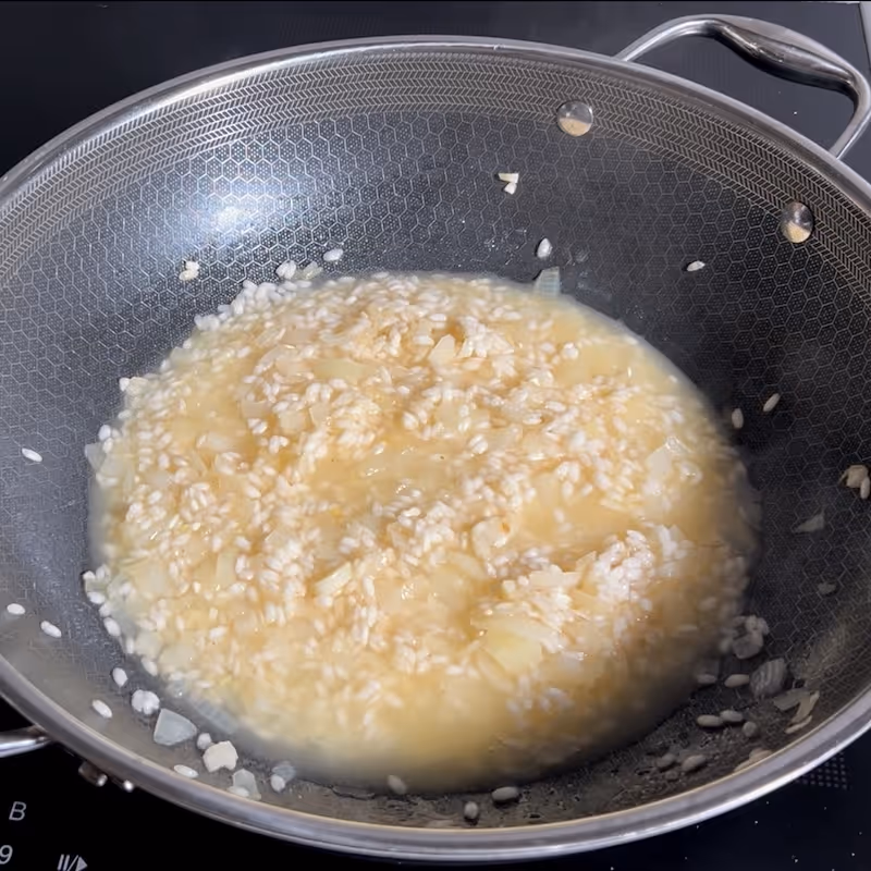 - Stir in the risotto rice and let it toast for a minute before pouring in a splash of Vermouth.