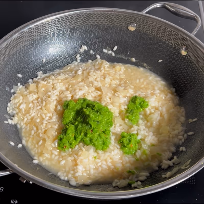 - Once the rice is nearly cooked (after 20 minutes), add the pea and mint puree.