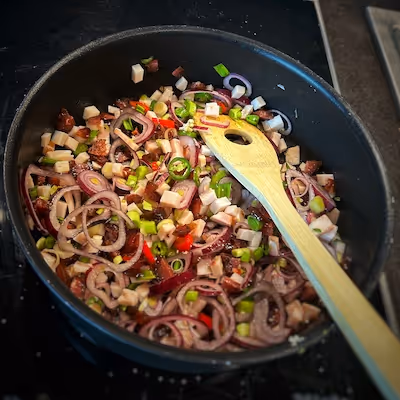 - Add chopped hot pepper to taste, one chopped onion, and two green garlic stems, cooking for another 2-3 minutes.