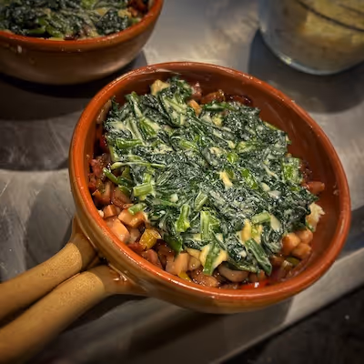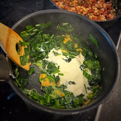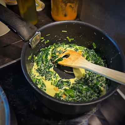 - Sauté the baby spinach and the cloves of garlic (if in season, you can also use wild garlic and green garlic).