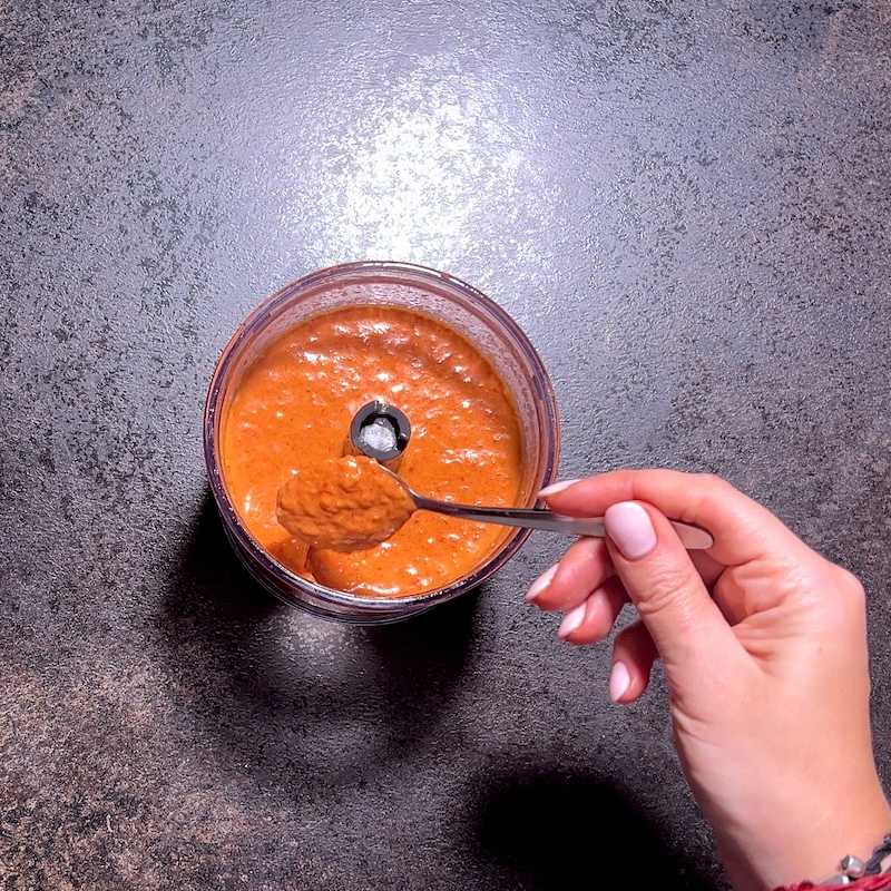 In traditional versions, whole nuts and olive oil are used. However, I chose almond butter instead of whole almonds and oil for two reasons: texture and accessibility. Almond butter creates a naturally creamy emulsion without requiring additional oil, making the sauce smoother and easier to blend. It also shortens the process, which aligns with my goal of creating an easy romesco sauce that fits everyday cooking.