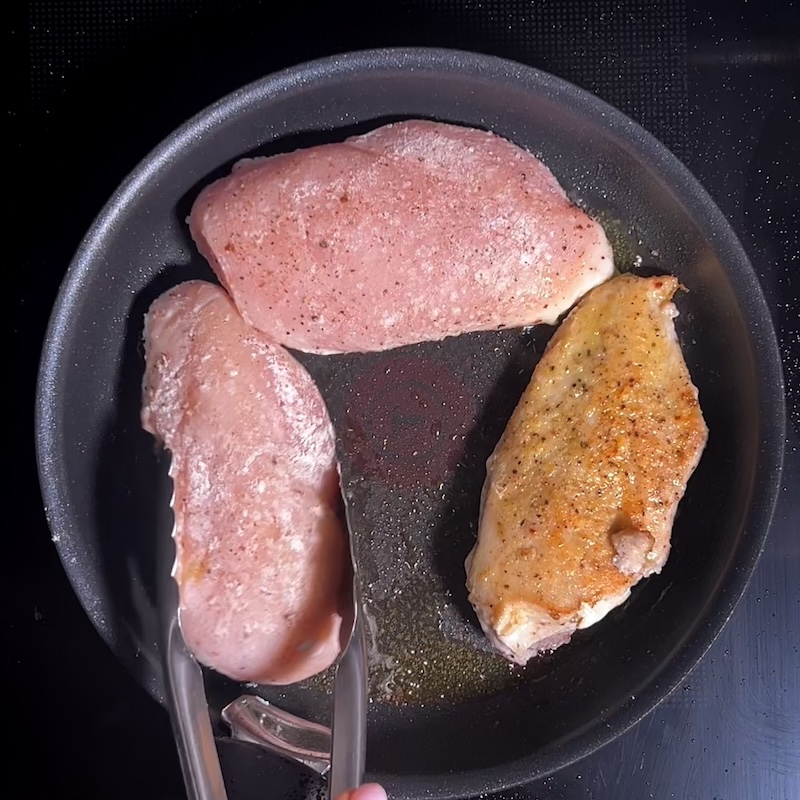 - Heat a wide pan with olive oil. Cook the chicken for about 4 minutes per side, until nicely golden.