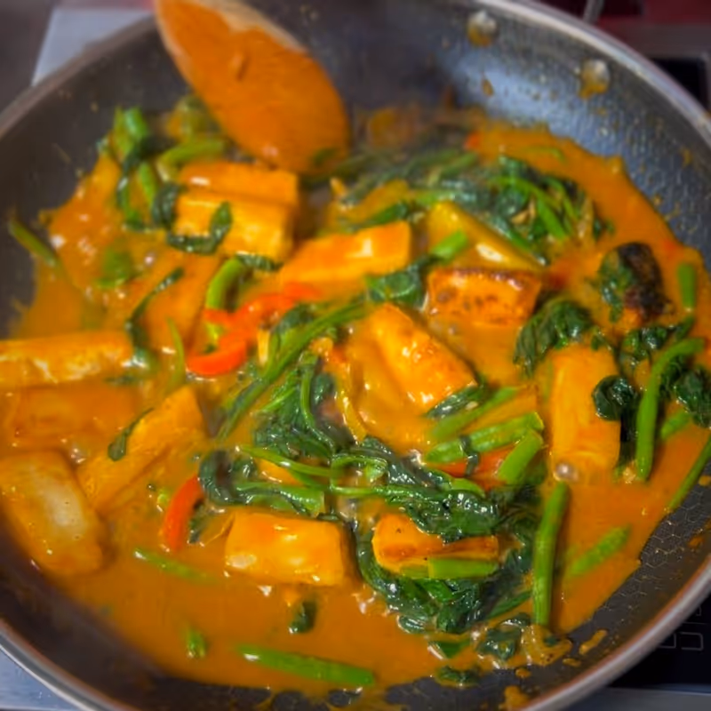 - Finish the Dish: Add the spinach, blanched green beans, and crispy tofu to the pan. Stir gently to coat everything in the sauce.