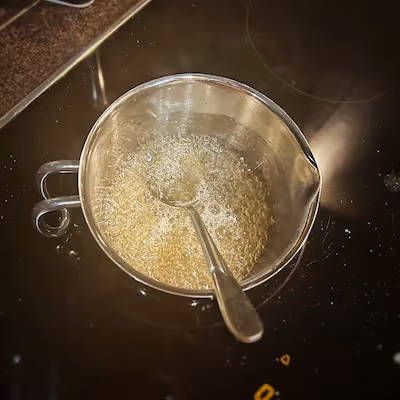 - In a saucepan, boil the caster sugar in the water until it reaches 118 degrees C.