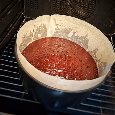- Line a 20 cm cake pan with baking paper and sprinkle cocoa powder on the bottom and sides of the pan.