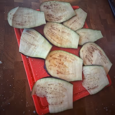 - Slice an eggplant into thin lengthwise slices, ensuring they're no thicker than 0.5 cm. Sprinkle some salt over them and let them sit for 2-3 minutes.