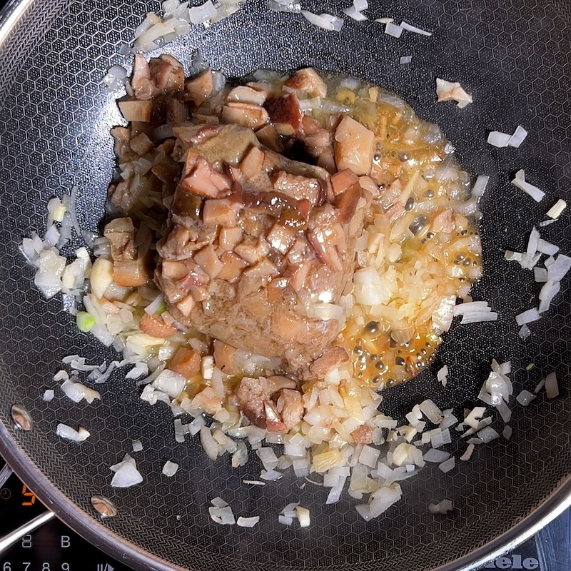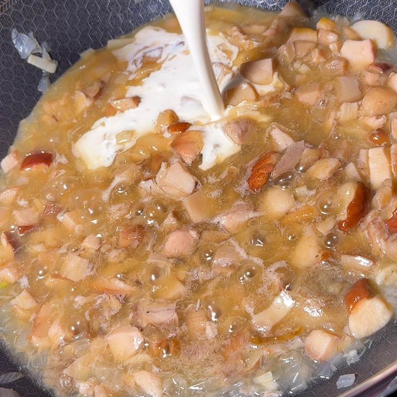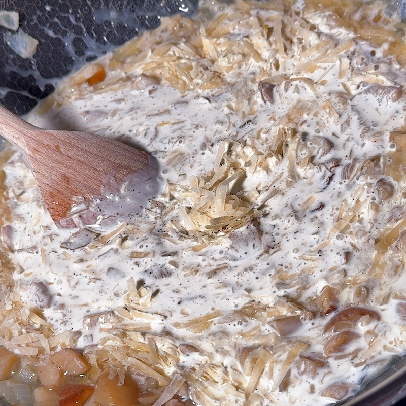 When I cook it at home, I start from the same philosophy: mushrooms first, patience over speed, and restraint with seasoning. Where I adapt the recipe is in the technique, not the soul. Instead of flour, I use a small amount of cornstarch, which allows the sauce to thicken while staying cleaner and lighter on the palate. Parmesan is not part of the traditional recipe—and that’s intentional on my part. I use it sparingly, not to turn this into an Italian dish, but to enhance umami and underline what the porcini already bring naturally.