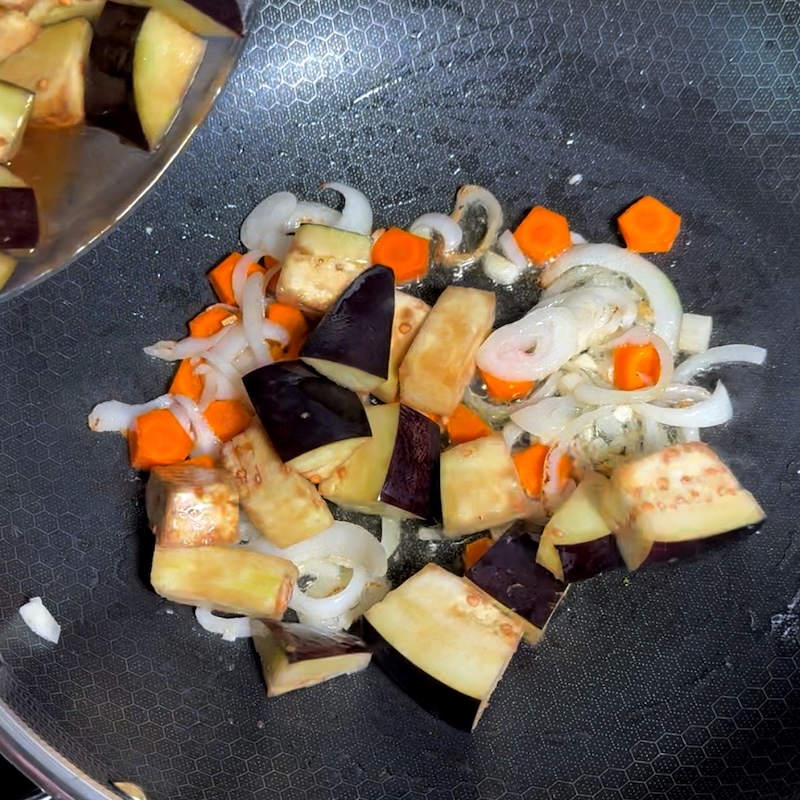 - Cook the eggplant: Add the marinated eggplant to the pan and stir-fry for 3–4 minutes until tender.