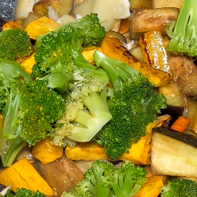 - Add eggplant, kabocha, and bell pepper; continue stir-frying, then add broccoli.