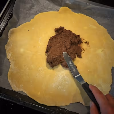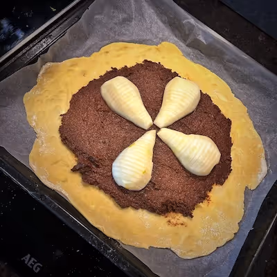 - Spread the frangipane filling over the dough.