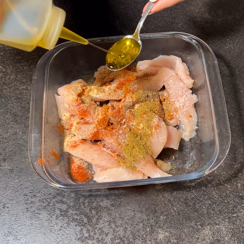 - Prepare the Chicken Fajitas Marinade: In a bowl, mix garlic powder, onion powder, cumin, both paprikas, brown sugar, and 1 tablespoon of olive oil.