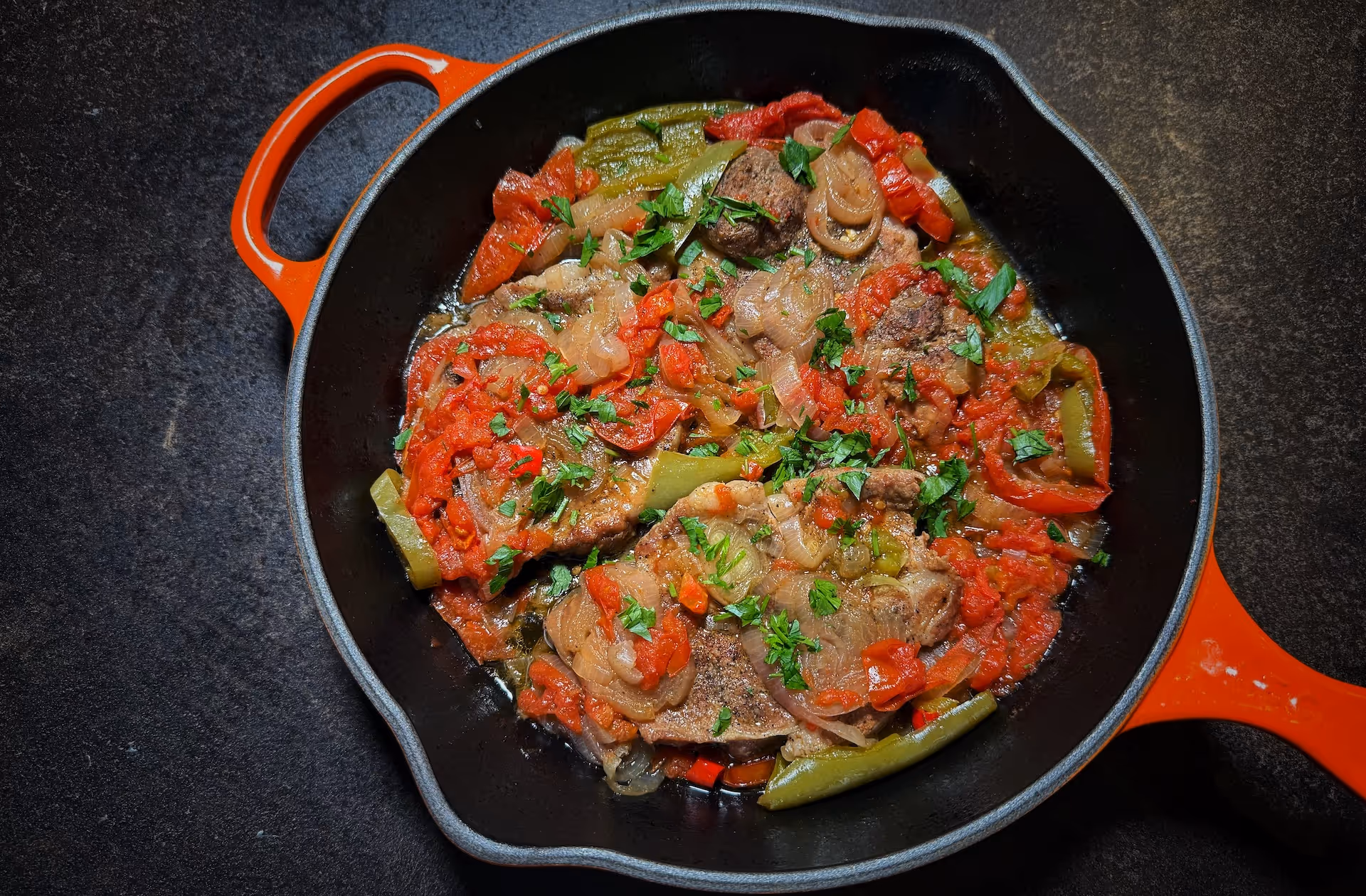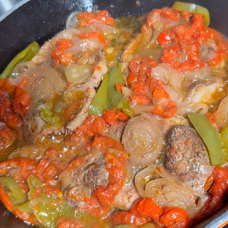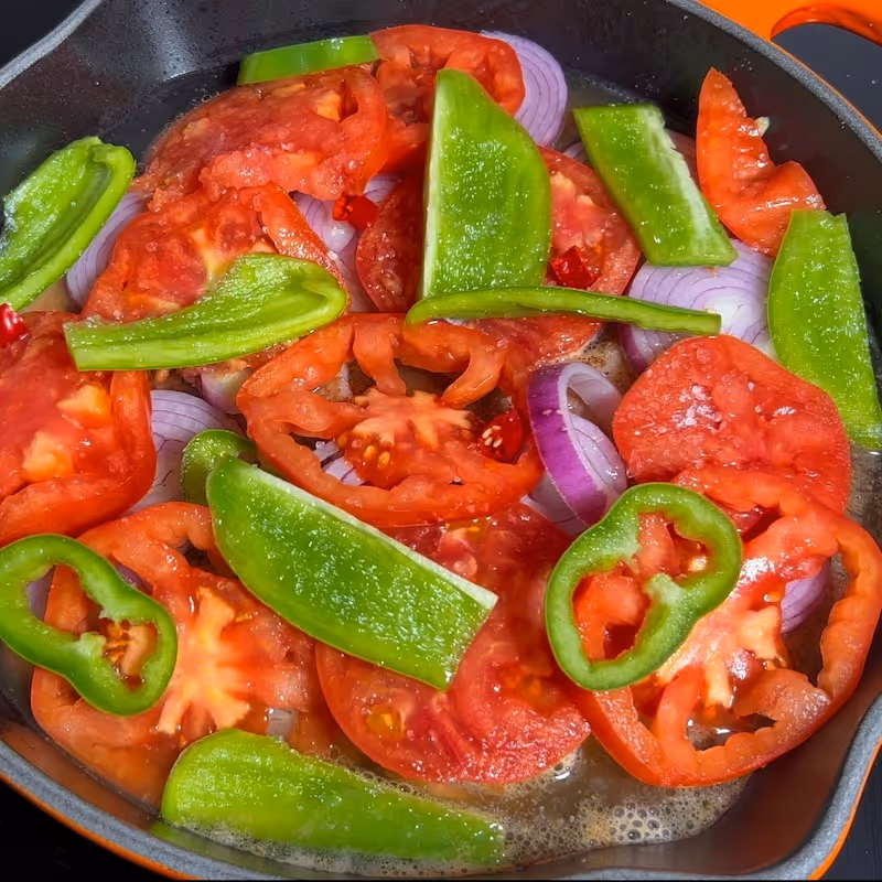 This dish is all about transforming simple ingredients into something cozy and satisfying: a fried pork steak that simmers gently in its own sauce, accompanied by onion, bell pepper, a pinch of chili, and tomato, until tender and juicy. It’s quick, comforting, and feels like home in every bite.