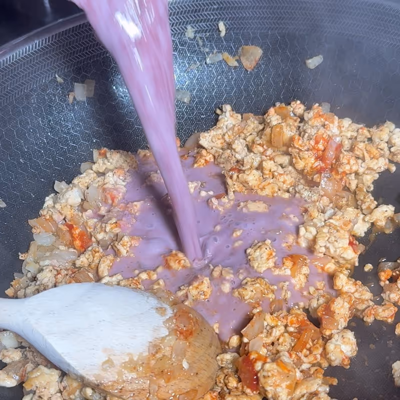 - Add the minced chicken or turkey and cook for about 2 minutes.