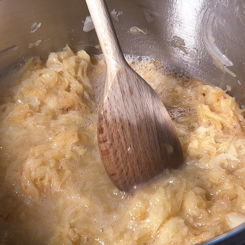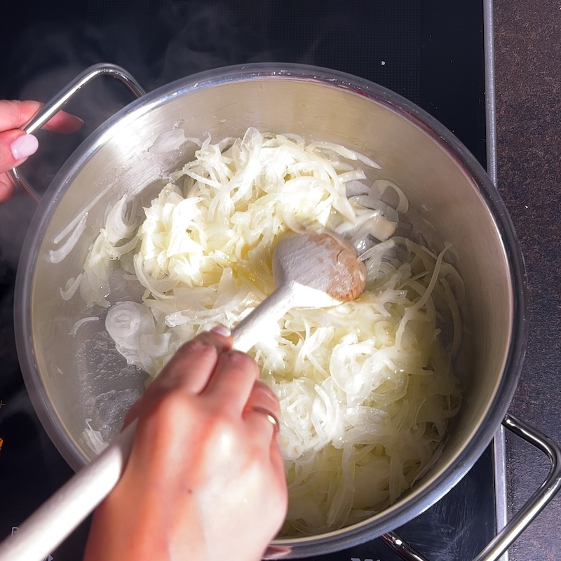 - Melt the butter in a wide pot. Add the onions and cook over low heat for 35–40 minutes, stirring occasionally.