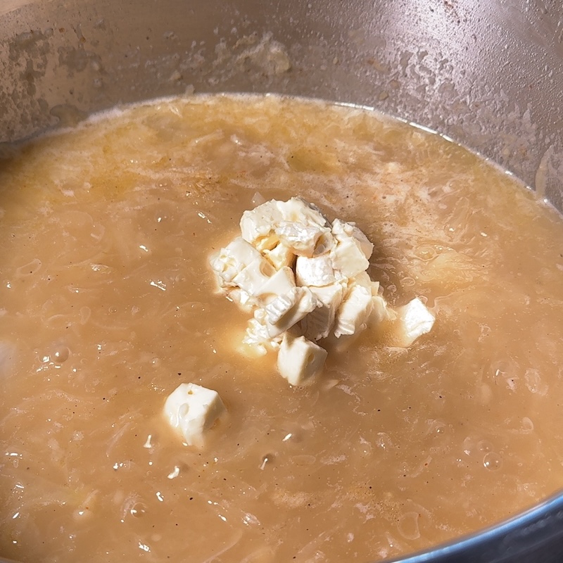- Camembert in the soup: Lower the heat to minimum. Add the Camembert in small pieces.