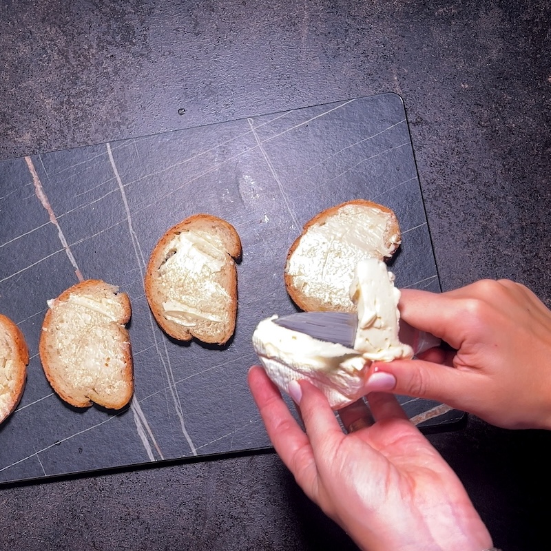 - The bread: Spread the bread slices with butter, add generous Camembert.
