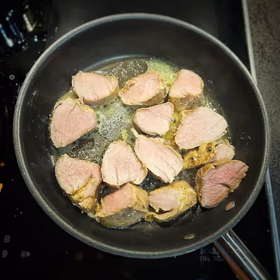 6. Cut the pork into 1 cm thick medallions and pan-fry them in a non-stick skillet with 1 knob of butter for 1 minute per side until slightly browned.