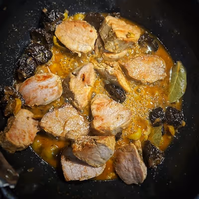 1. Make the marinade by combining the salt, pepper, bay leaves, dried plums, olives, capers, red wine vinegar, garlic powder, dry thyme, spicy smoked paprika, orange juice, 1 tbsp olive oil, brown sugar, vermouth, and spiced rum.