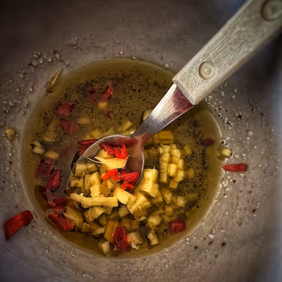 - While the lentils are cooling, chop a red chili and some fresh ginger. In a bowl, combine the chili, ginger, a pinch of salt, 1 teaspoon of sugar, rice vinegar, and olive oil.