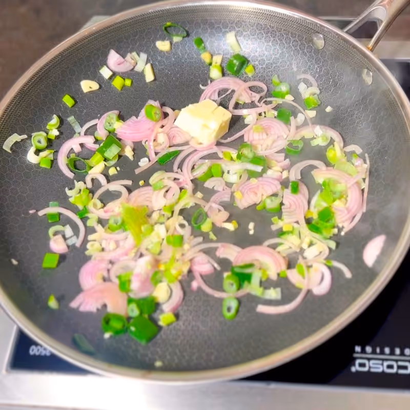 - Prepare the Filling: Heat ½ tbsp olive oil over medium heat. Add 1 chopped onion, 1 chopped green onion, and 1 tbsp butter to a skillet.