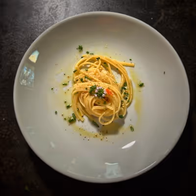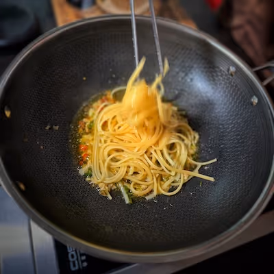This dish originates from Naples and uses basic ingredients: garlic, olive oil, chili peppers, and spaghetti.