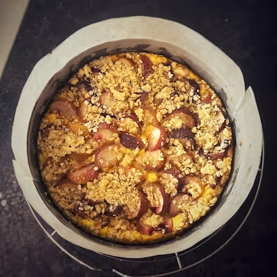 - Prepare the crumble by mixing 40g of flour, 25g of brown sugar, 25g of cold butter, and 20g of rolled oats.