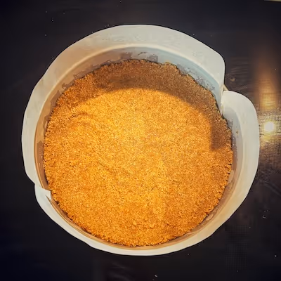 - Prepare a 20cm springform pan by lining both the bottom and sides with parchment paper. Press the biscuit mixture into the pan, leveling it with a spatula or glass. You can also press the mixture up the sides of the pan if you prefer.