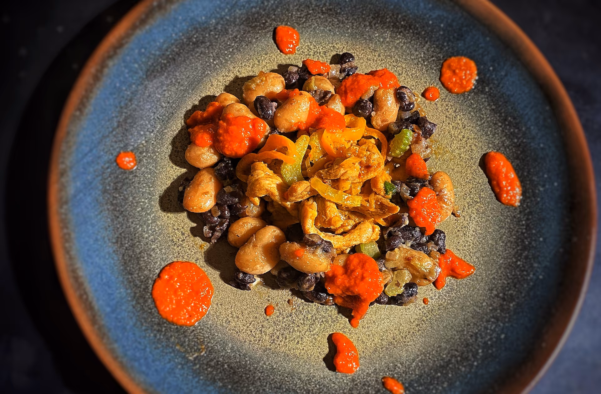 So let's see how to make fajitas using pork, beans, and smoky hot salsa.